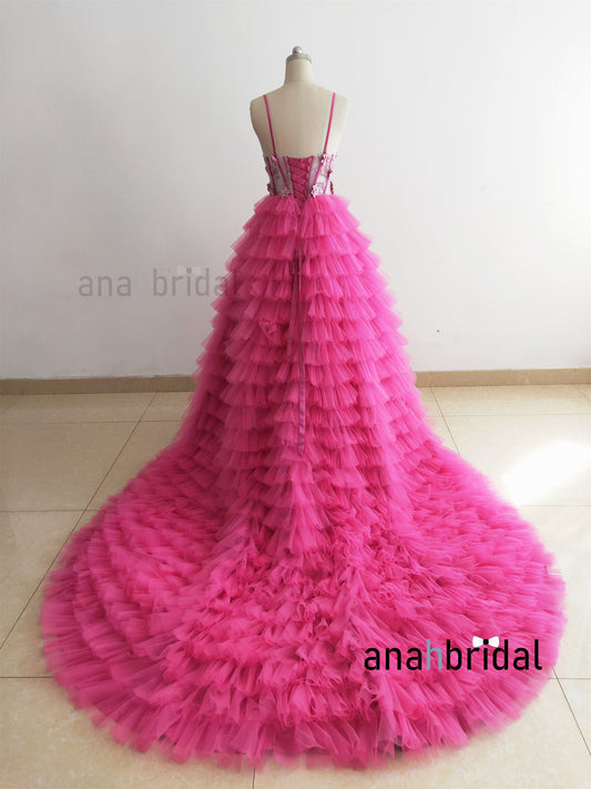 Spaghetti Straps Hot Pink Ruffled Photo Shoot Dress
